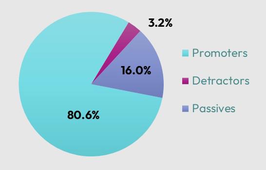 The high Net Promoter Score reflects strong trust and satisfaction among our customers, with 80.6% identified as promoters and only 3.2% as detractors.
